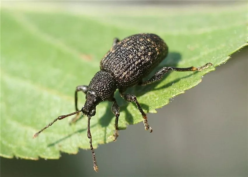 Der Dickmaulrüssler gehört zur Gruppe der Rüsselkäfer. Die grauen, ca. 1 cm langen Käfer fressen bei Dunkelheit an den Blättern verschiedener Gehölze und Stauden.