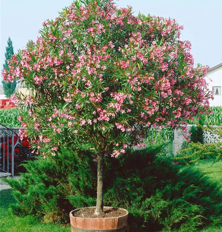 Der Oleander, Stamm (Nerium oleander) ist eine sehr beliebte Kübelpflanze. Seine rosafarbenen, weißen oder gelben Blüten erscheinen von Juni bis September. Verwenden Sie bevorzugt die spezielle Kübelpflanzenerde, denn sie verdichtet sich über längere Zeit nicht.