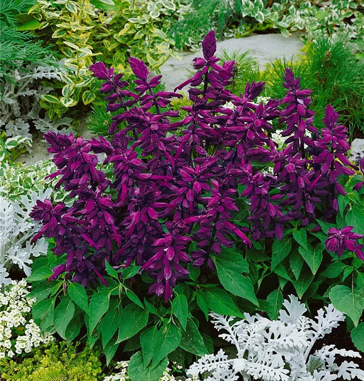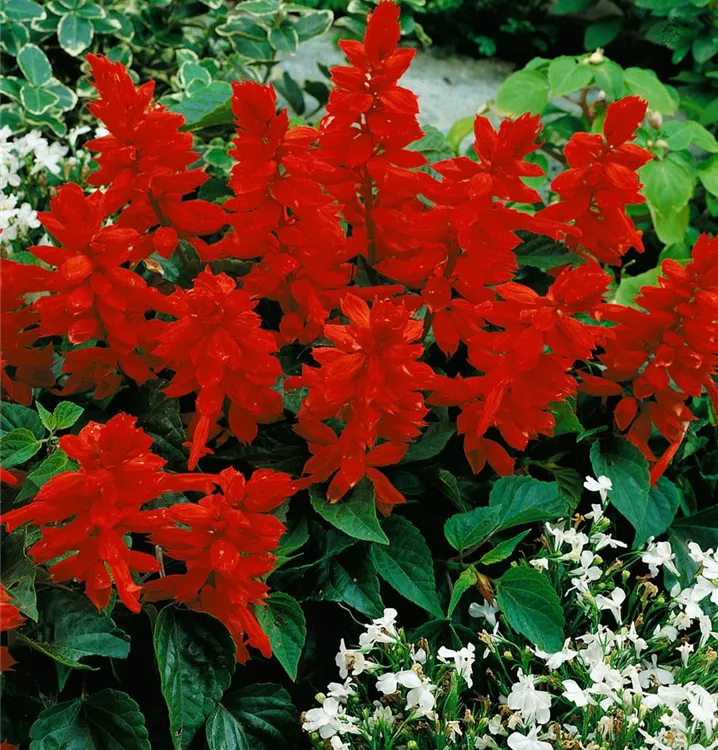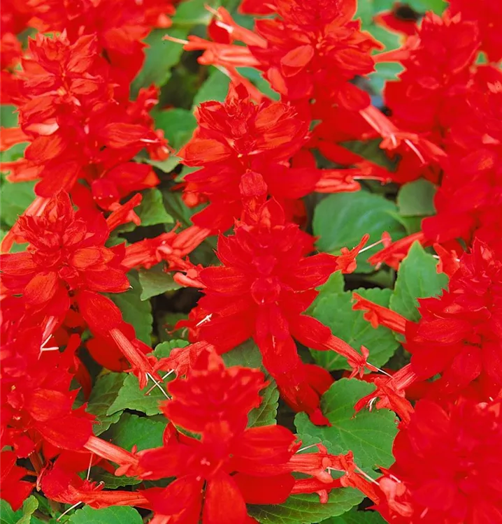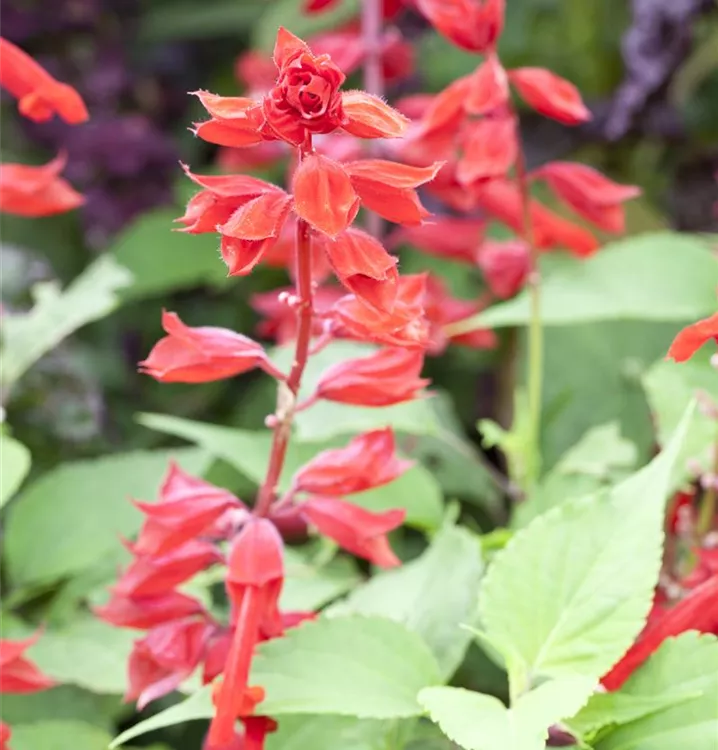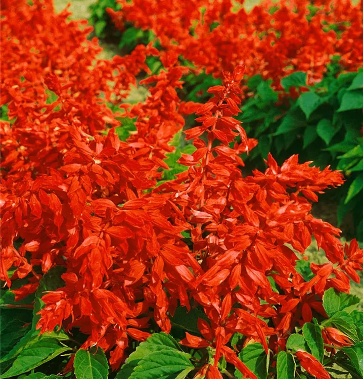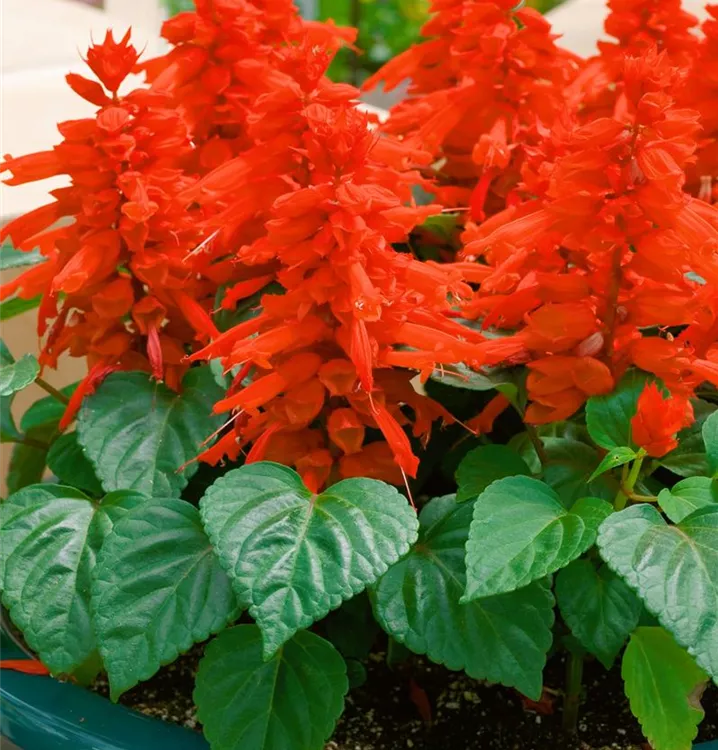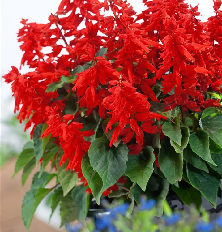 Der Feuersalbei (Salvia splendens) ist eine beliebte Pflanze für den Balkon. Die unzähligen Blüten erscheinen, je nach Sorte, in verschiedenen Farben die ganze Saison hindurch. Ein sonniger Standort und ein durchlässiges Substrat werden bevorzugt.