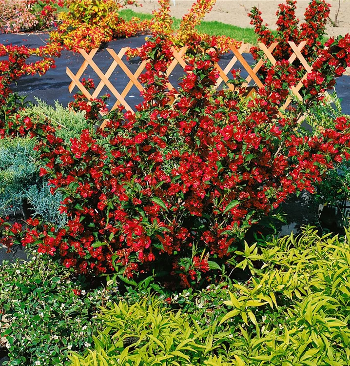Die Weigelie 'Nain Rouge'<sup>®</sup> (Weigela) eine kompakte, rundliche Gartenpflanze, die, je nach Sorte, Blüten in verschiedenen Farben hervorbringt. An einem sonnigen bis halbschattigen Standort mit lockerem, nährstoffreichem Boden erreicht sie gewöhnlich eine Höhe von ca. 80 cm und wird ca. 80 cm breit.