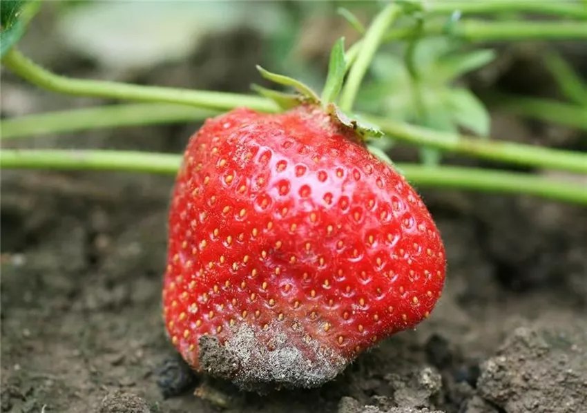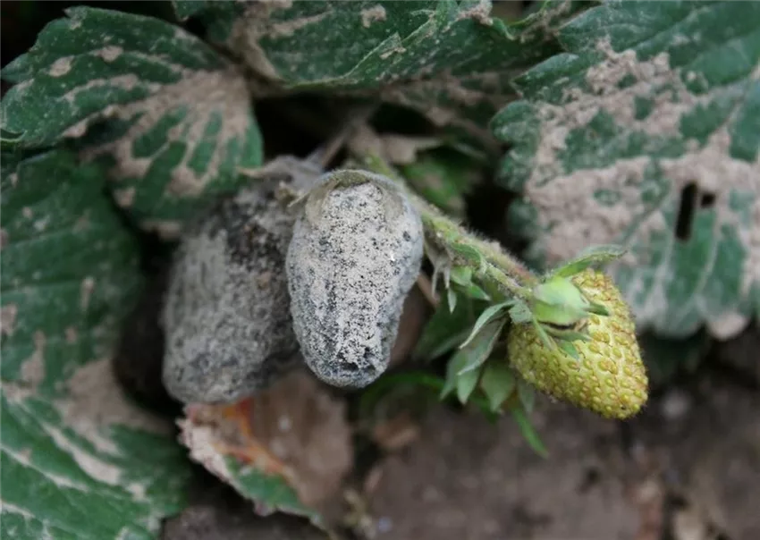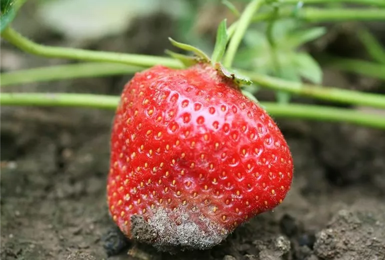 Unreife Früchte zeigen braune Stellen, die sich ausdehnen. Auf diesen Faulstellen entsteht der typische mausgraue Schimmelrasen, der sich auch auf schon reifen Früchten bilden kann.