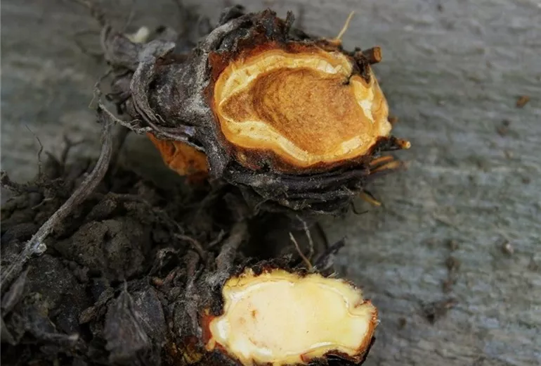 Der Erreger der Rhizomfäule ist ein Pilz (Phytophthora cactorum), der jahrelang im Boden überleben kann. Schwere und stark verdichtete Böden fördern diese Krankheit.