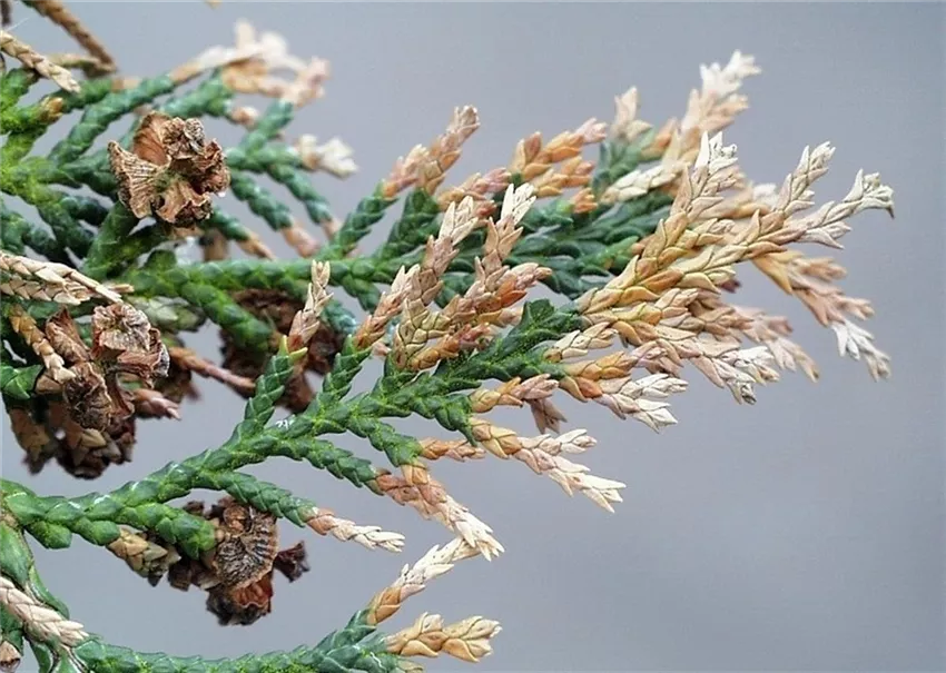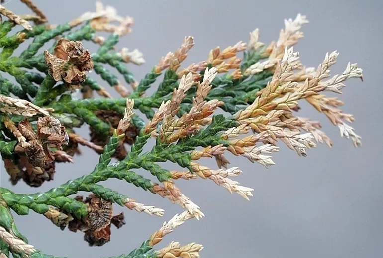 Triebspitzen und kleinere Zweige von Scheinzypressen (Chamaecyparis) sind anfangs gelblich, später dann braun gefärbt.