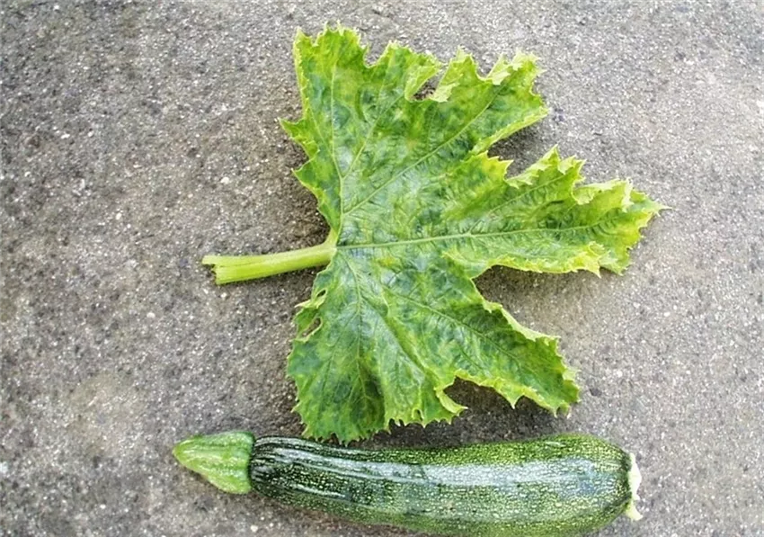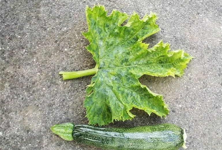 Zucchinifrüchte sind auffällig beulenartig deformiert und oft heller als gesunde Früchte. Die Blätter zeigen eine helle mosaikartige Scheckung. Das Blattwachstum ist gebremst.