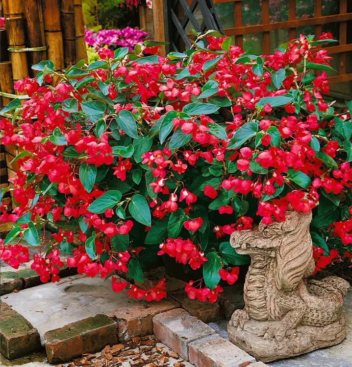 Begonia 'Dragon Wing Red' bildet während der gesamten Saison zahlreiche rote Blüten.