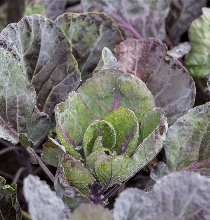 Die Blätter des Rosenkohls sind blau-grün, weiß geädert, rundlich, gewellt.