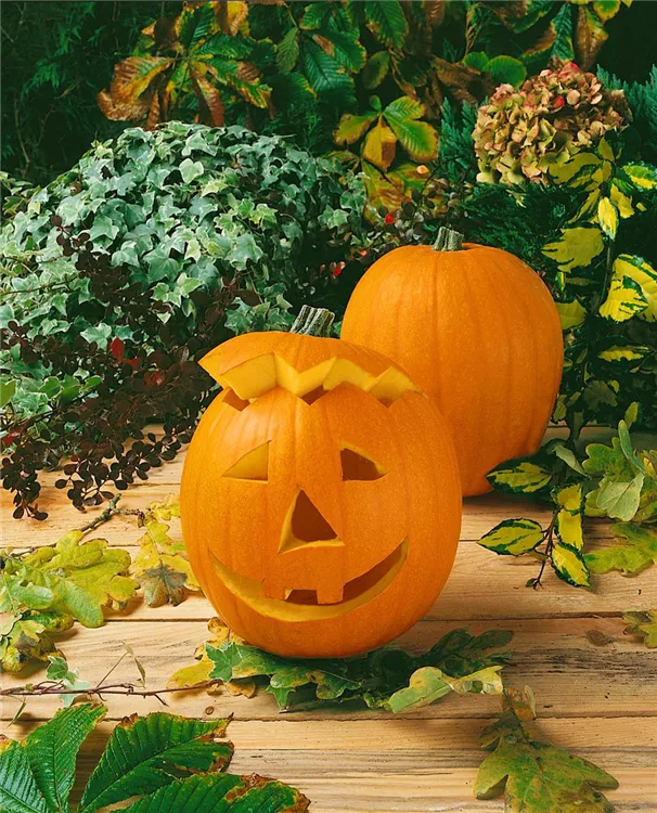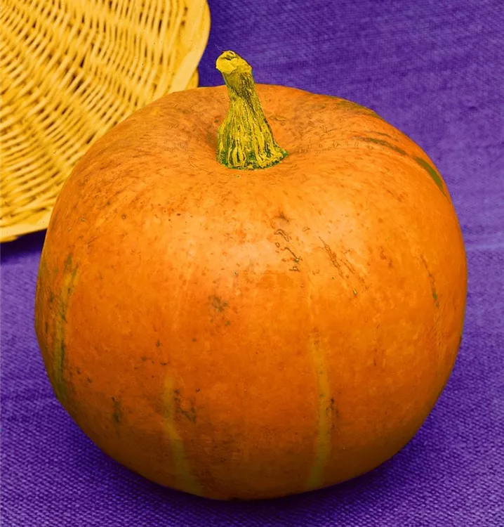 Der Speisekürbis 'Sankt Martin F1' (Cucurbita maxima) bildet Früchte, die aromatisch schmecken und bereits ab September geerntet werden können. Für das optimale Wachstum des Speisekürbises 'Sankt Martin F1' werden ein sonniger Standort und durchlässiger, nährstoffreicher Boden benötigt.