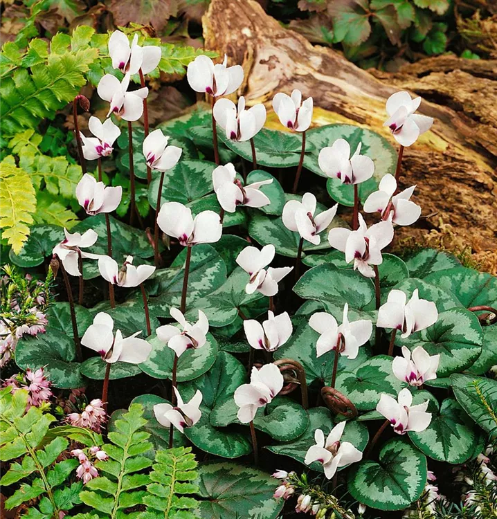 Das Alpenveilchen (Cyclamen) ist eine Zwiebelpflanze mit ansehnlichen Blüten. Bevorzugt wird ein durchlässiger, lockerer Boden in sonniger bis halbschattiger Lage. Die Staude erreicht gewöhnlich eine Höhe von 15 - 25 cm.