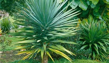 Der Drachenbaum (Dracaena draco) trägt blau-grüne Blätter. Diese aufrechte Pflanze gedeiht am besten an einem sonnigen bis halbschattigen Standort.