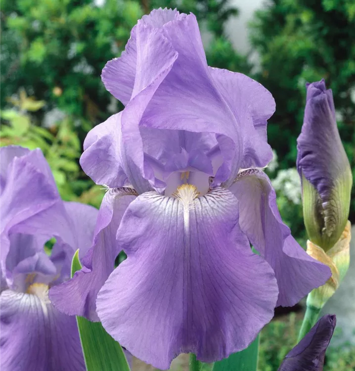 Die Hohe Bart-Iris (Iris x germanica) ist eine aufrechte, rhizombildende Staude, die, je nach Sorte, lippenförmige Blüten in verschiedenen Farben bildet. An einem sonnigen Standort mit durchlässigem, kalkhaltigem, nährstoffreichem Boden erreicht sie gewöhnlich eine Höhe von ca. 80 cm und wird ca. 40 cm breit. Die Hohe Bart-Iris ist gut frostverträglich.