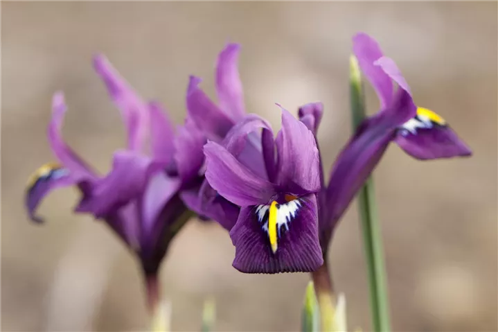 Die Zwiebel-Schwertlilie (Iris reticulata) ist eine aufrechte, kompakte, rhizombildende Staude, die von Februar bis März blaue Blüten mit einem angenehmen Duft bildet. An einem sonnigen Standort mit durchlässigem, lockerem Boden erreicht sie gewöhnlich eine Höhe von ca. 15 cm und wird ca. 8 cm breit. Die Zwiebel-Schwertlilie ist gut frostverträglich.