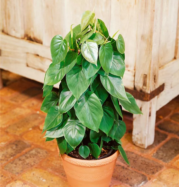 Der Philodendron (Philodendron scandens) trägt dunkelgrüne, herzförmige Blätter. Diese rankende Pflanze gedeiht am besten an einem hellen bis schattigen Standort.