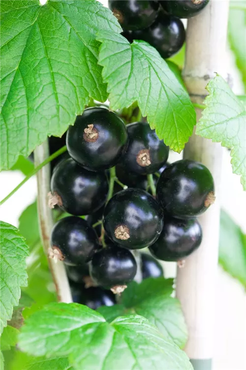 Die Johannisbeere 'Bona'(s) (Ribes nigrum) bildet schwarze Beeren. Diese sind süß-säuerlich im Geschmack. Für eine ertragreiche Ernte ab Juli schaffen durchlässiger, nährstoffreicher Boden und ein sonniger bis halbschattiger Standort optimale Bedingungen. Auch ihre grün-roten Blüten sind eine schöne Erscheinung.