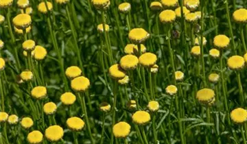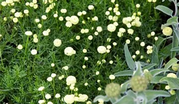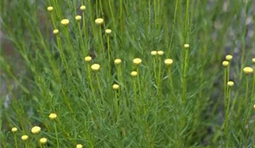 Santolina rosmarinifolia bildet ballförmige, gelbe Blüten ab Juli.