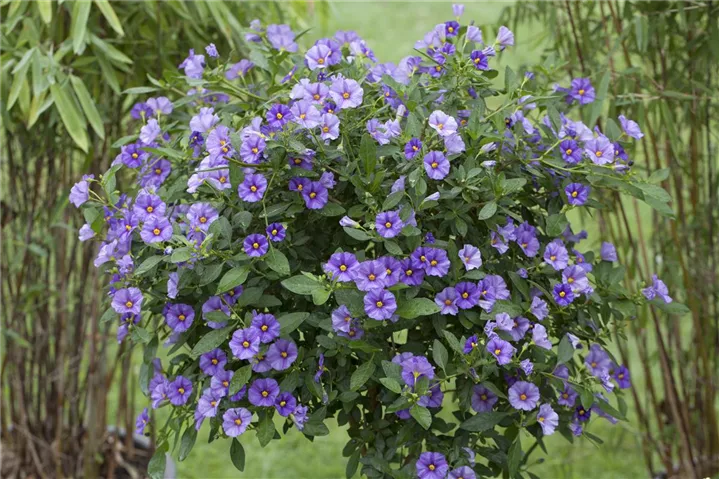 Solanum rantonnetii blau, Stamm bildet während der gesamten Saison zahlreiche sternförmige, blaue Blüten.