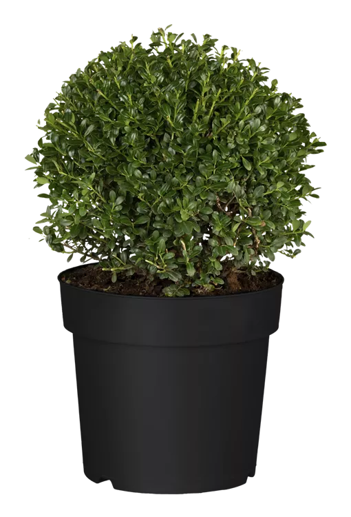 Ilex crenata 'Robustico', Kugel kann Größen von bis zu 3,5 m Höhe und 2 m Breite erreichen. Ideal für ein gesundes Wachstum ist ein sonniger bis halbschattiger Standort mit durchlässigem und lockerem Boden.